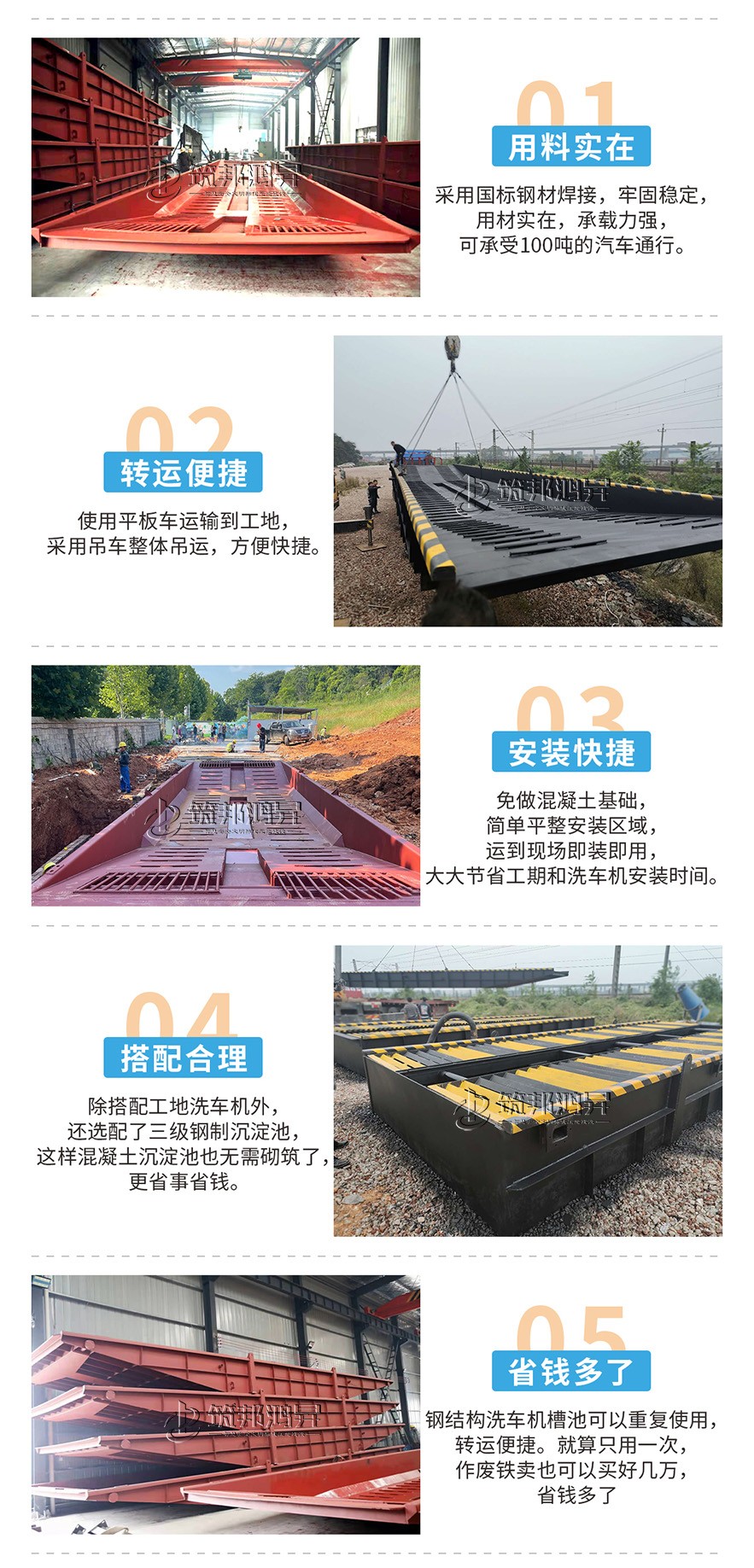 筑邦鴻昇研發的鋼結構移動洗車槽池采用整體設計,整體吊運,用料厚實。替代了之前的工地洗車機下面的水泥基礎,更加牢固方便,節省了大量的基礎砌筑人工和材料,還可以重復使用。如果不需要重復使用;十幾噸重的洗車槽做廢鐵賣,也能賣好幾萬,大大節省了施工時間和成本。鋼結構洗車槽池常規款式有16.6米長和13米長,尺寸可以定制。