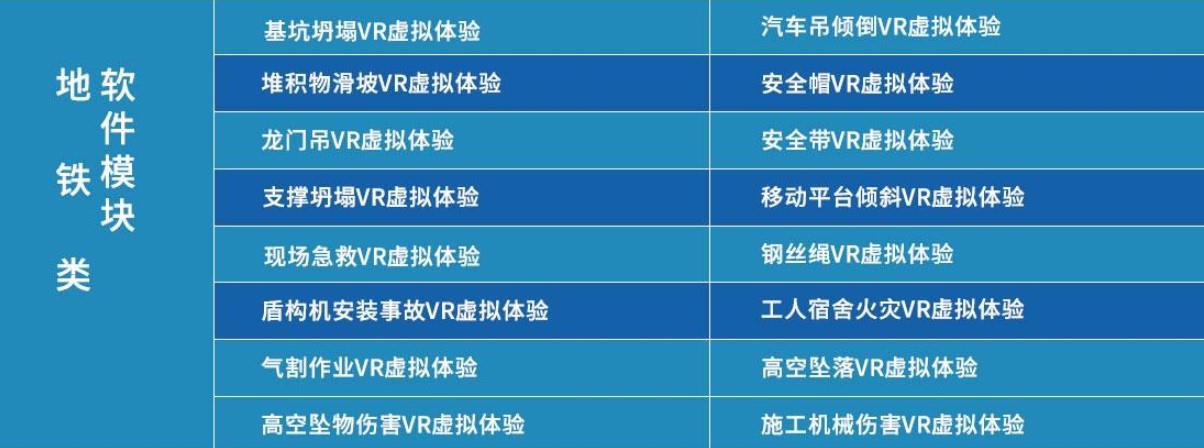 地鐵類軟件模塊主要有施工機械傷害VR體驗、氣割傷害VR體驗、安全帽撞擊、宿舍火災、高空墜物傷害、基坑支撐坍塌、基坑坍塌、現場急救、安全帶使用、汽車吊側翻、移動平臺傾倒、安全用電觸電、高空墜落等多個VR體驗項目。
