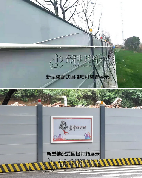 新型裝配式圍擋(B類)還集成了噴淋系統、廣告燈箱、警示燈等多種功能,具有模塊化、低成本、防護性能好、可重復使用等優點。該款圍擋在工廠通過流水線精細化生產,不僅保證了圍擋的質量及形象,而且提高了現場裝配施工效率,原技術需要十余天工期的圍擋建設,現在僅僅花費了不到五分之一的時間就可完成,且無需現場二次施工。