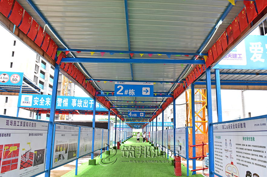 安全通道,施工現場實行人車分流,主要人員出入通道搭設了專用安全通道,安全通道兩側設置宣傳欄,提升施工作業人員的質量意識、安全意識。