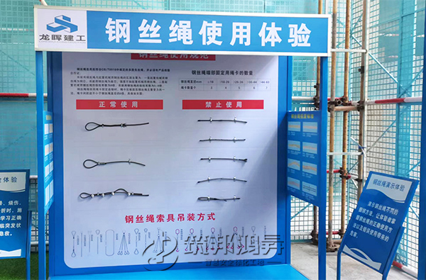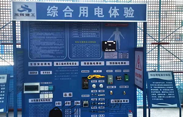 此次合作的工地安全體驗館建設包括了綜合用電體驗、安全帶使用體驗、鋼絲繩使用體驗、班前講評臺、安全急救培訓體驗、洞口墜落體驗、安全帽撞擊體驗、安全防護用品展示體驗、墻體傾倒體驗、滅火器演示體驗等。筑邦安排專車送貨到商洛工地,同時安排了專業人手迅速到工地加班加點完成安裝。